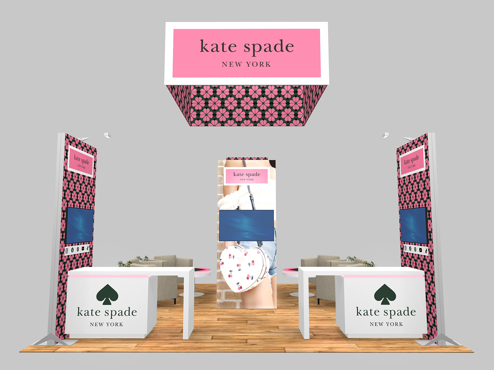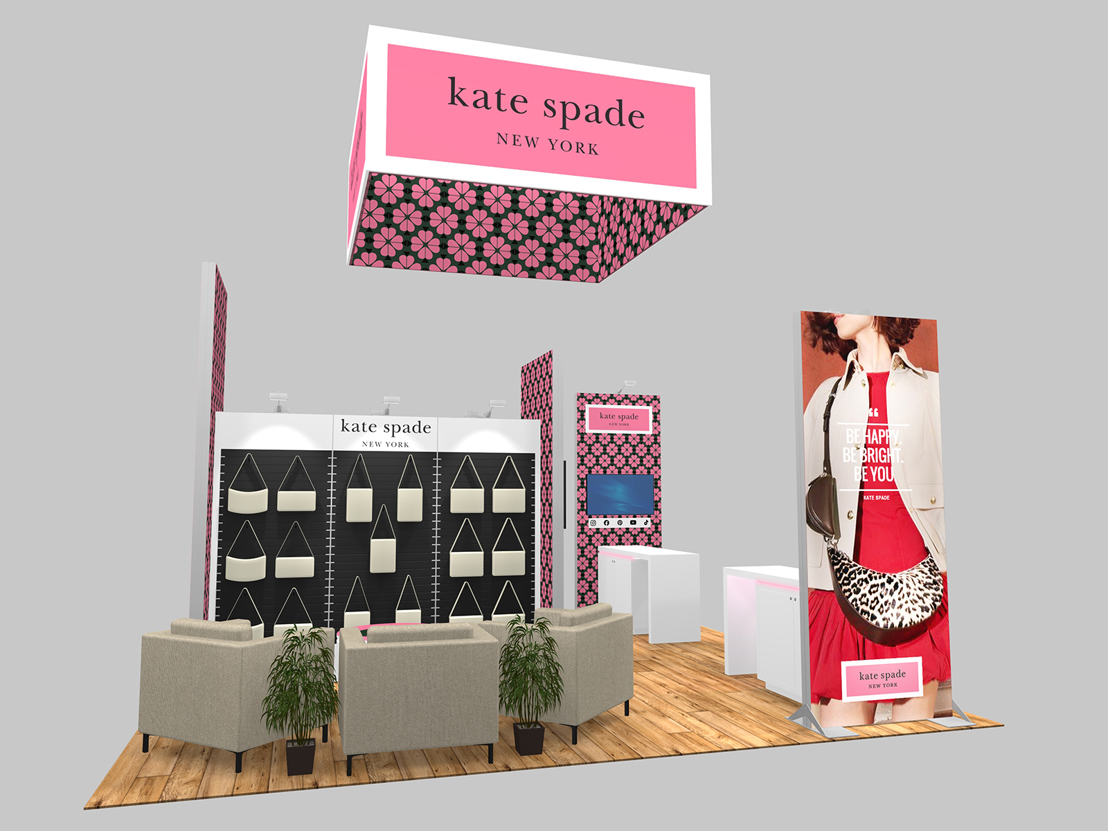 Throughout the booth, the brand takes center stage with colorful front lit and backlit graphics, branding on the counters and wireless charging tables, and the large, unmistakable logo on the hanging sign. It’s spare, but not spartan, and the layout is efficient as a meeting space for staff and attendees.